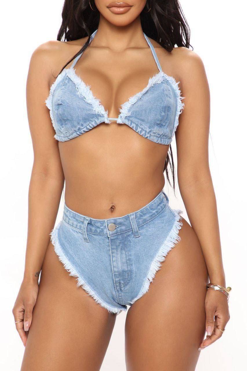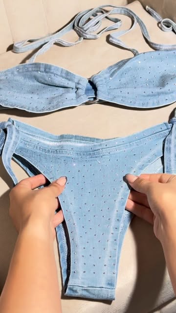 ست دو تیکه جین کاغذی بند سرشونه مدل گردنی فری سایز